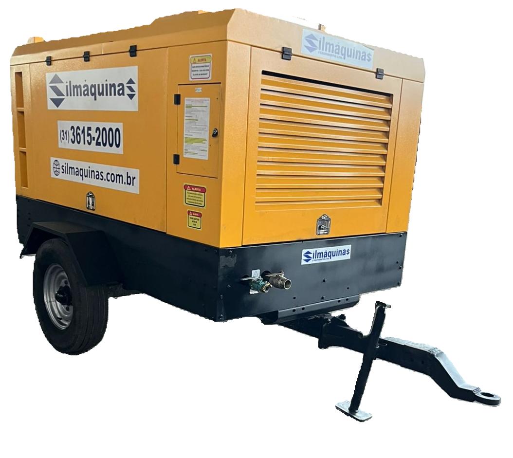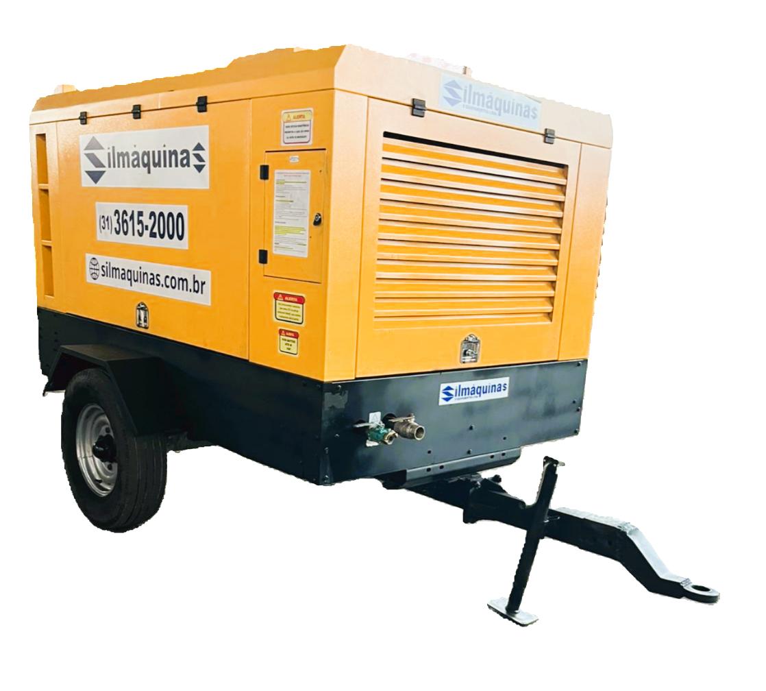 Compressor montado sobre chassi com duas rodas e cambão para transporte.